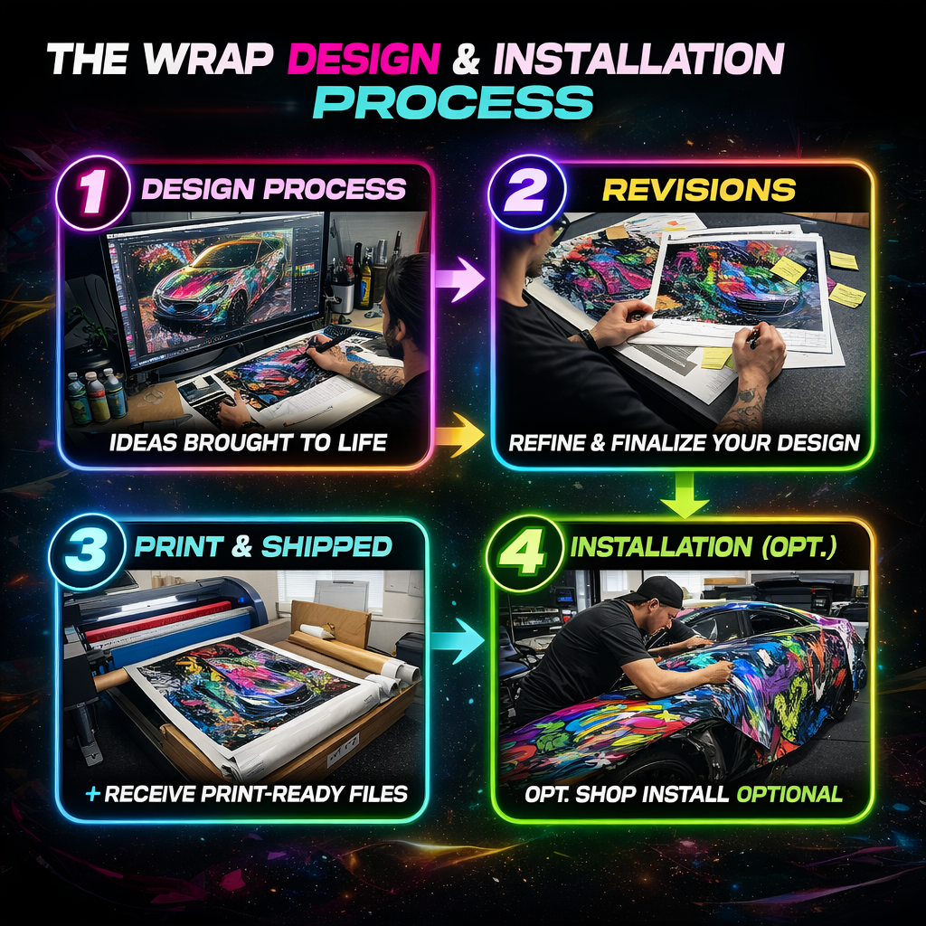 Yes, we offer both custom design and printing services. You can start with just a rough concept or idea, and our team will help develop it into a complete, polished design. We handle everything through the final printing stage, ensuring your wrap is ready for application. Additionally, we can connect you with a trusted local wrap shop for professional installation, making the entire process seamless from concept to finished vehicle.